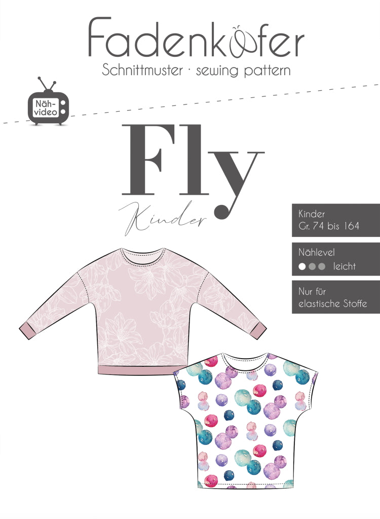 Fly ist ein schnell genähtes Shirt mit überschnittenen Ärmeln, das du sowohl mit langen als auch kurzen Ärmeln nähen kannst. Zudem hast du die Wahl zwischen einer Version mit Beleg am Ausschnitt oder einem Bündchen. Fly kann ganz leicht im angesagten Colour-Blocking-Style genäht werden – eine Anleitung dafür ist enthalten.