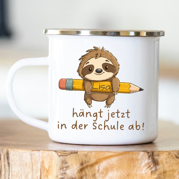 Personalisierte Emailletasse Schulkind 234 Faultier hängt ab