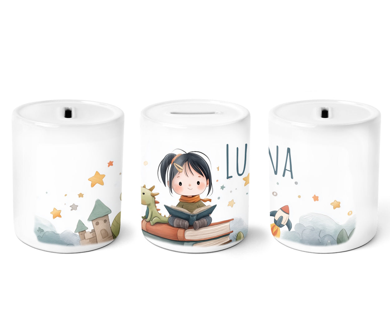 Was diese Spardosen so besonders macht, ist die Möglichkeit, sie ganz individuell zu personalisieren. Verleihe dem Kinderzimmer eine persönliche Note, indem du den Namen deines kleinen Schatzes oder eine besondere Botschaft auf der Spardose verewigst. Unsere hochwertige Drucktechnologie sorgt dafür, dass die Personalisierung nicht nur schön aussieht, sondern auch langlebig ist – genau wie die Träume, die in dieser Spardose Platz finden.